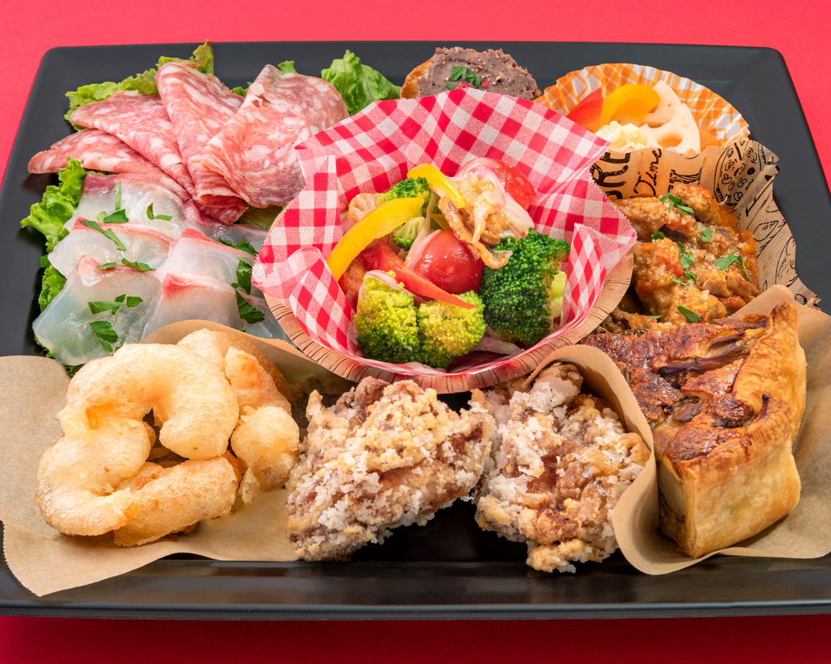 イタリアサラミ、ブルスケッタ(オープンサンド)、カルパッチョ、魚介のマリネ、自家製ピクルス、あべどりの唐揚げ、季節のキッシュ、旬野菜のフリットなど
